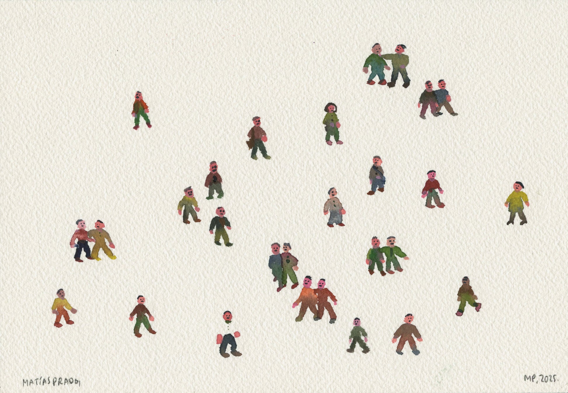 Descripción: Ilustración original en acuarela con personajes en una caminata o una pausa. Algo cotidiano, lleno de encuentros casuales y momentos compartidos.